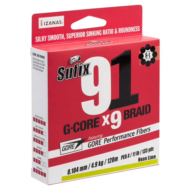 Das runde Profil sorgt dafür, dass die Schnur beim Wurf nur minimal mit den Ringen in Berührung kommt. Das Ergebnis ist eine sehr geringe Reibung und eine hohe Wurfweite.Die brandneue, extrem glatte und gleitfähige Beschichtung der Schnur sorgt für minimale Reibung, längere Würfe und eine längere Lebensdauer.GORE, der Hersteller von GORE-TEX, und Sufix haben gemeinsam eine geflochtene Weitwurfschnur entwickelt, die aus acht UNHMPE-Fasern + einer GORE®-Faser (=9) besteht.